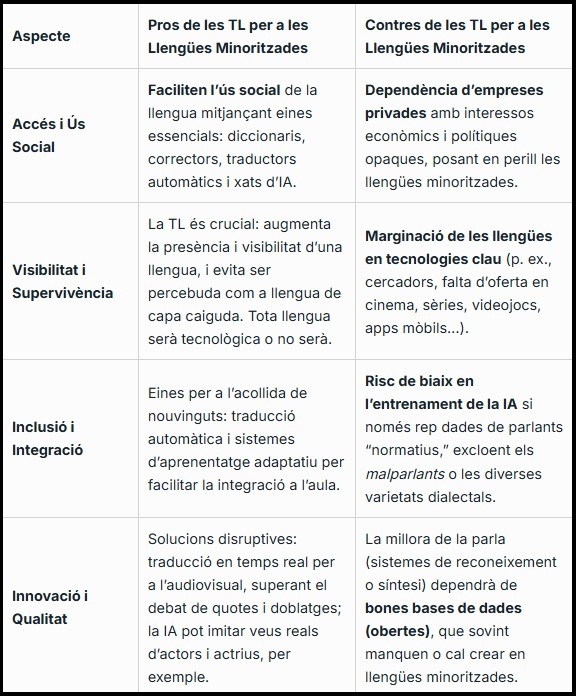 Les tecnologies lingüístiques (TL) són definides doncs com tots aquells mitjans tècnics, artefactes i sistemes que permeten o ajuden a la comunicació en una o més llengües. Els malparlants són crucials per al desenvolupament d’aquestes tecnologies, incloent-hi la traducció automàtica i els sistemes basats en intel·ligència artificial (IA). Hi ha però pros i contres en la relació de les TL amb les llengües minoritzades del món (Taula 1).