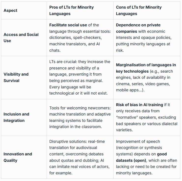 In short, significant investment and technological effort are required to give visibility to minority languages. While it is crucial to depoliticise languages, there is also a need for deliberate linguistic policy within the technological domain. Education remains the cornerstone for combating prejudice and promoting linguistic use, embracing both ‘bad speakers’ and new technologies, within a delicate yet productive feedback loop.